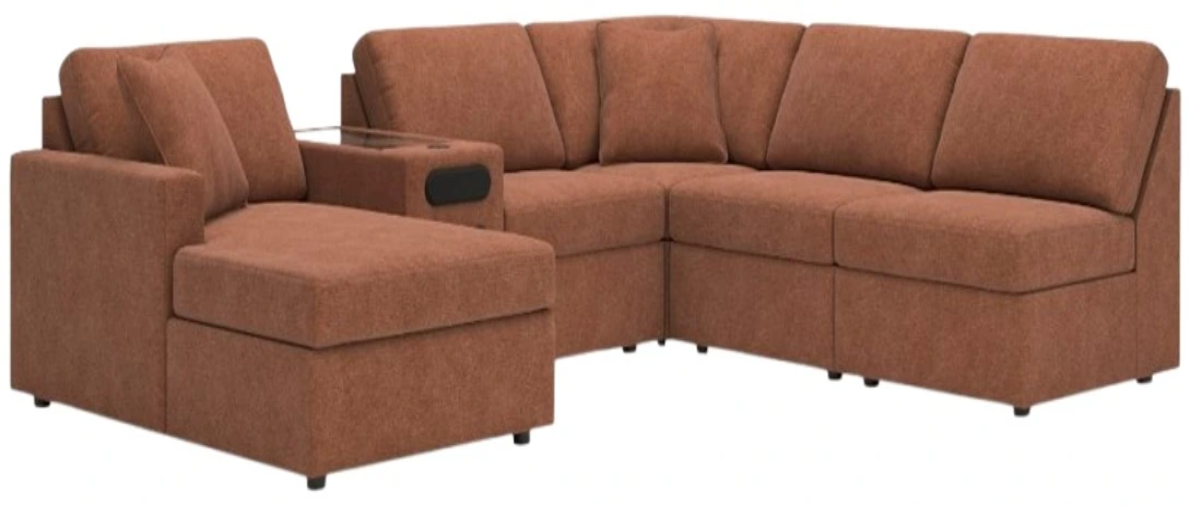 Includes 6 Modular Pieces: Left-arm facing corner chaise, audio console with storage, wedge and 3 armless chairs